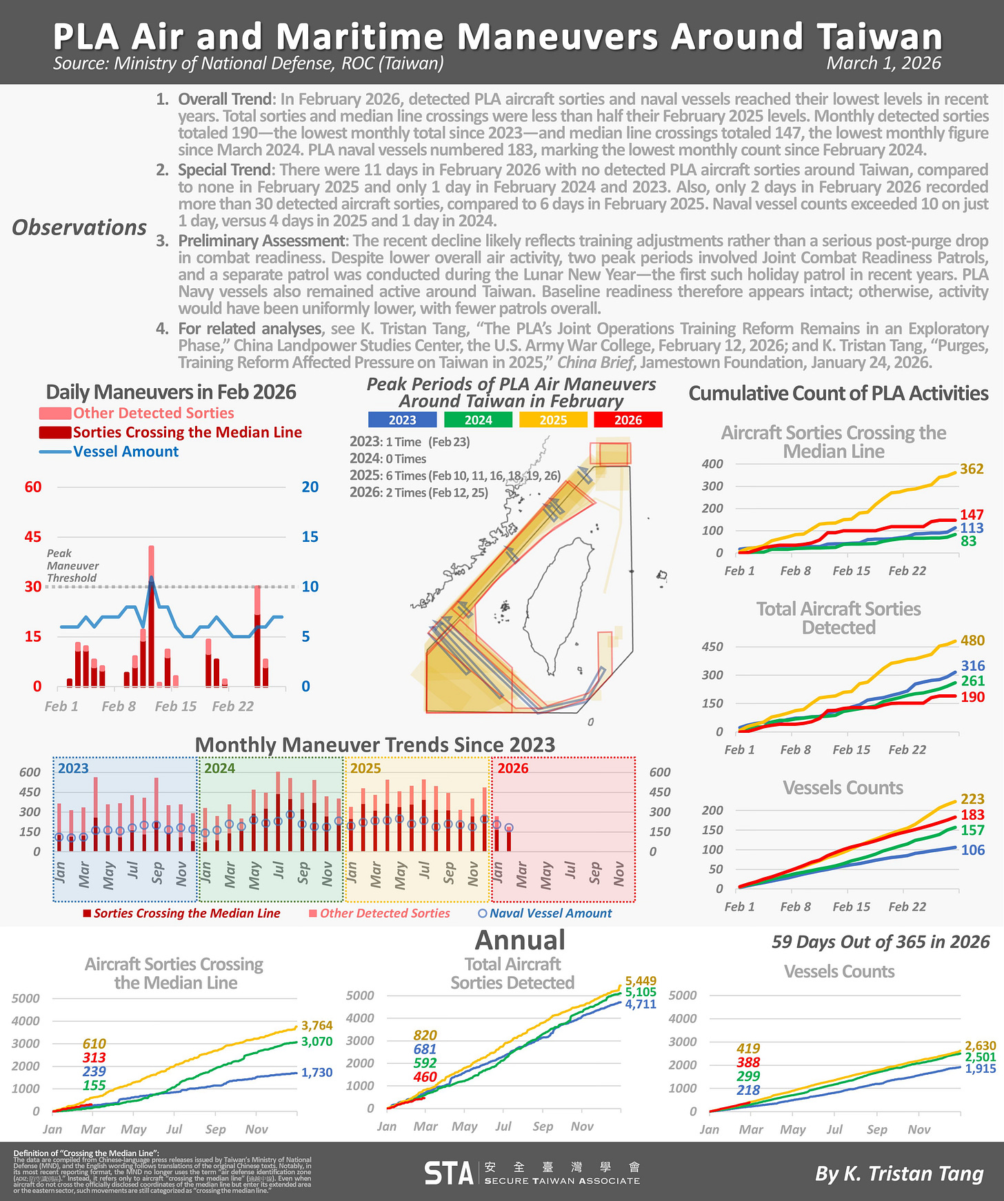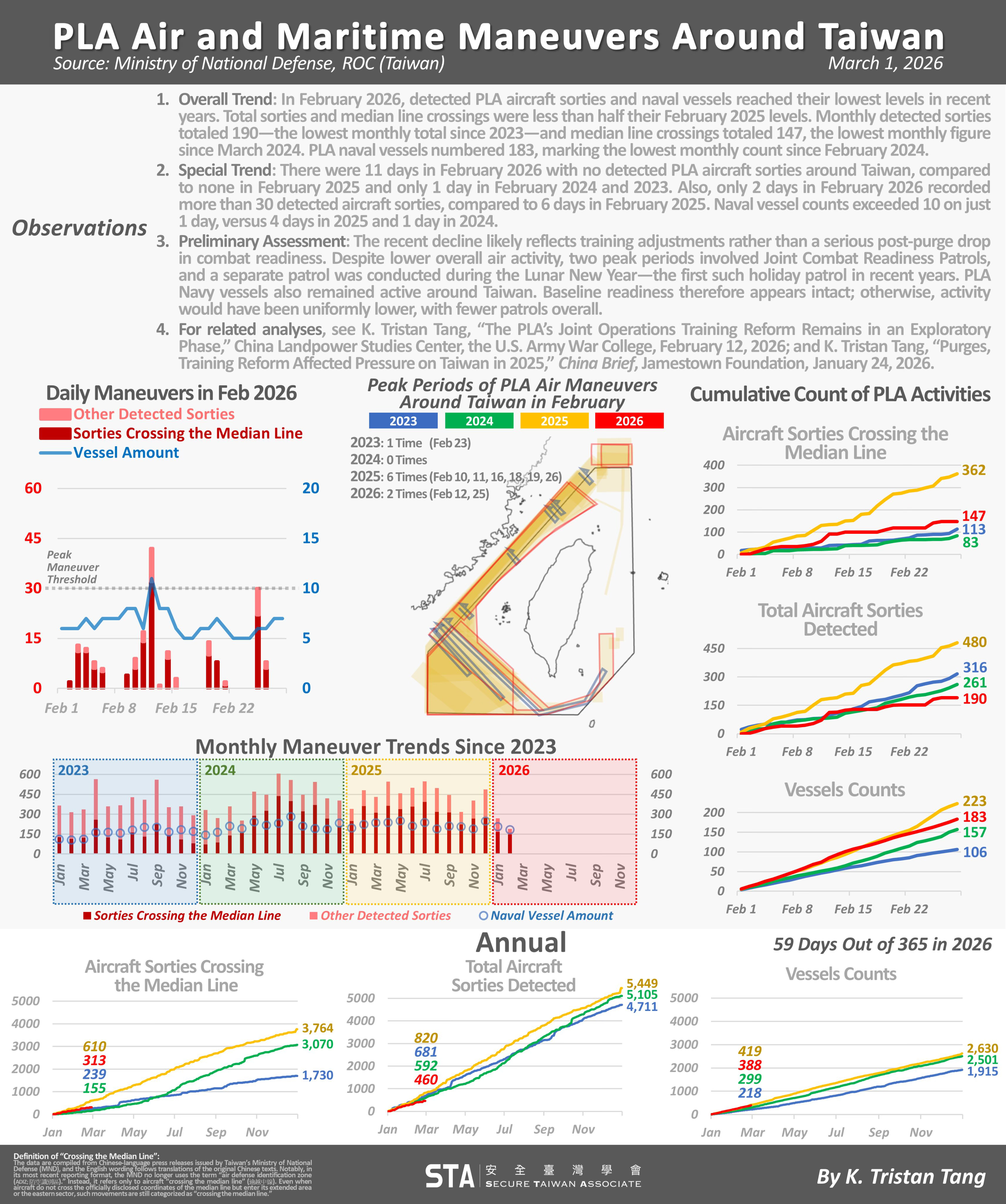 China’s Low Tempo Air Operations Around Taiwan. This week, PLA aircraft activity near Taiwan showed a fascinating pattern. After an eight-day absence of detected flights—the longest such stretch since systematic tracking began—Chinese military aircraft resumed operations on 7 March. The pause has generated speculation about causes ranging from mechanical maintenance cycles to deliberate strategic signalling. Taiwan’s Defense Minister Wellington Koo cautioned legislators that absence of air incursions should not imply absence of PLA activity, noting that sea-based operations continued without pause.