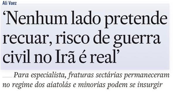 Excelente entrevista do diretor para o Irã do International Crisis Group, Ali Vaez. Destaco o trecho acima, em que Vaez traça possíveis resultados para a guerra. São quatro: