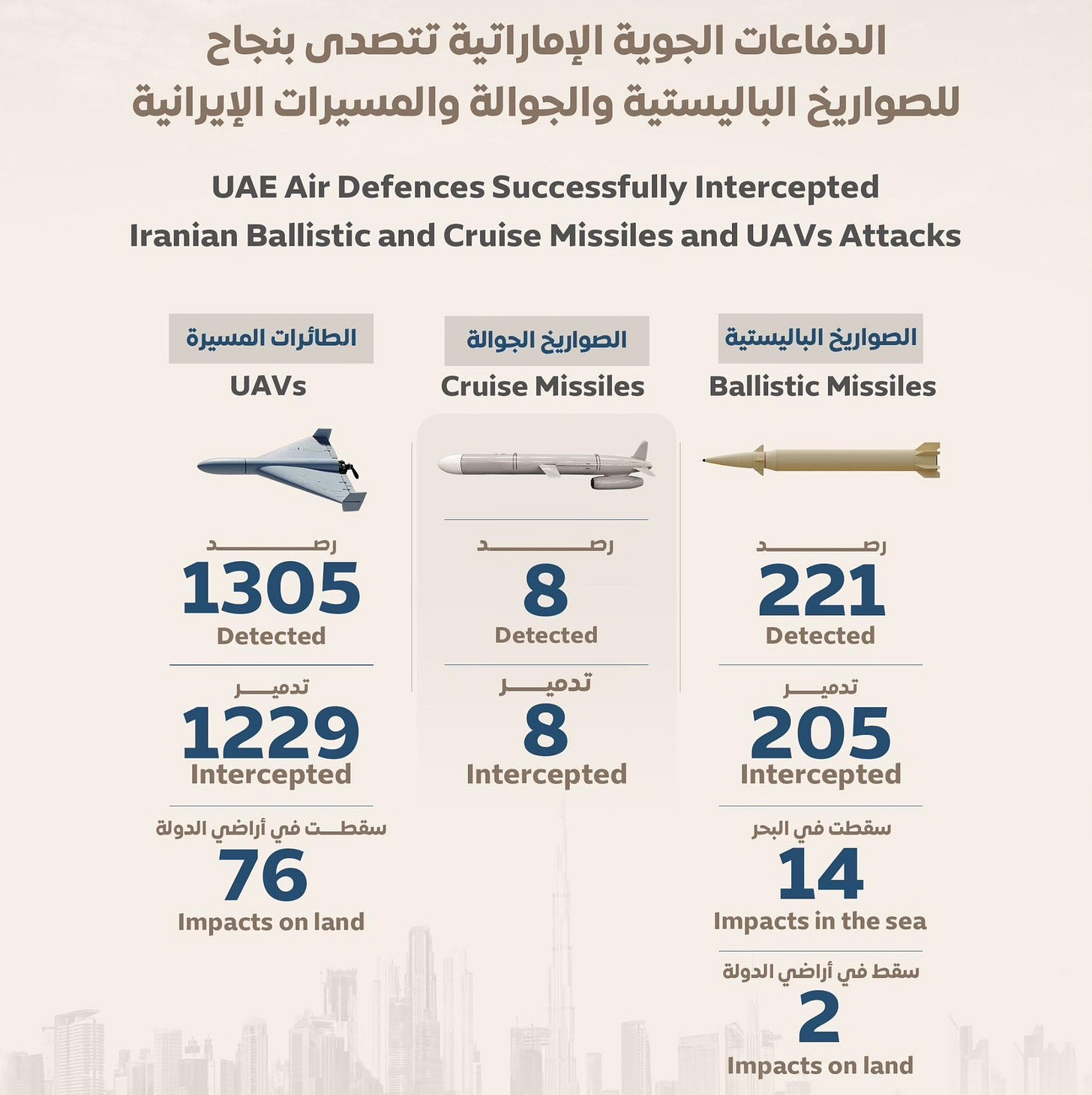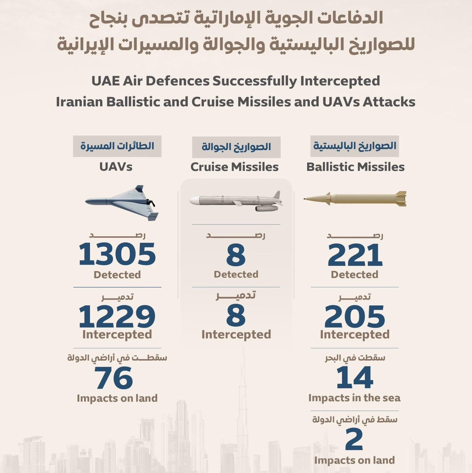 Because I have published a few articles on this topic throughout the week, I will focus on the statistics of the war for this section of the update. The first is an update from the UAE Ministry of Defence (as at 7 March) that covers the drone and missiles strikes against the country since the start of the new Iran War.