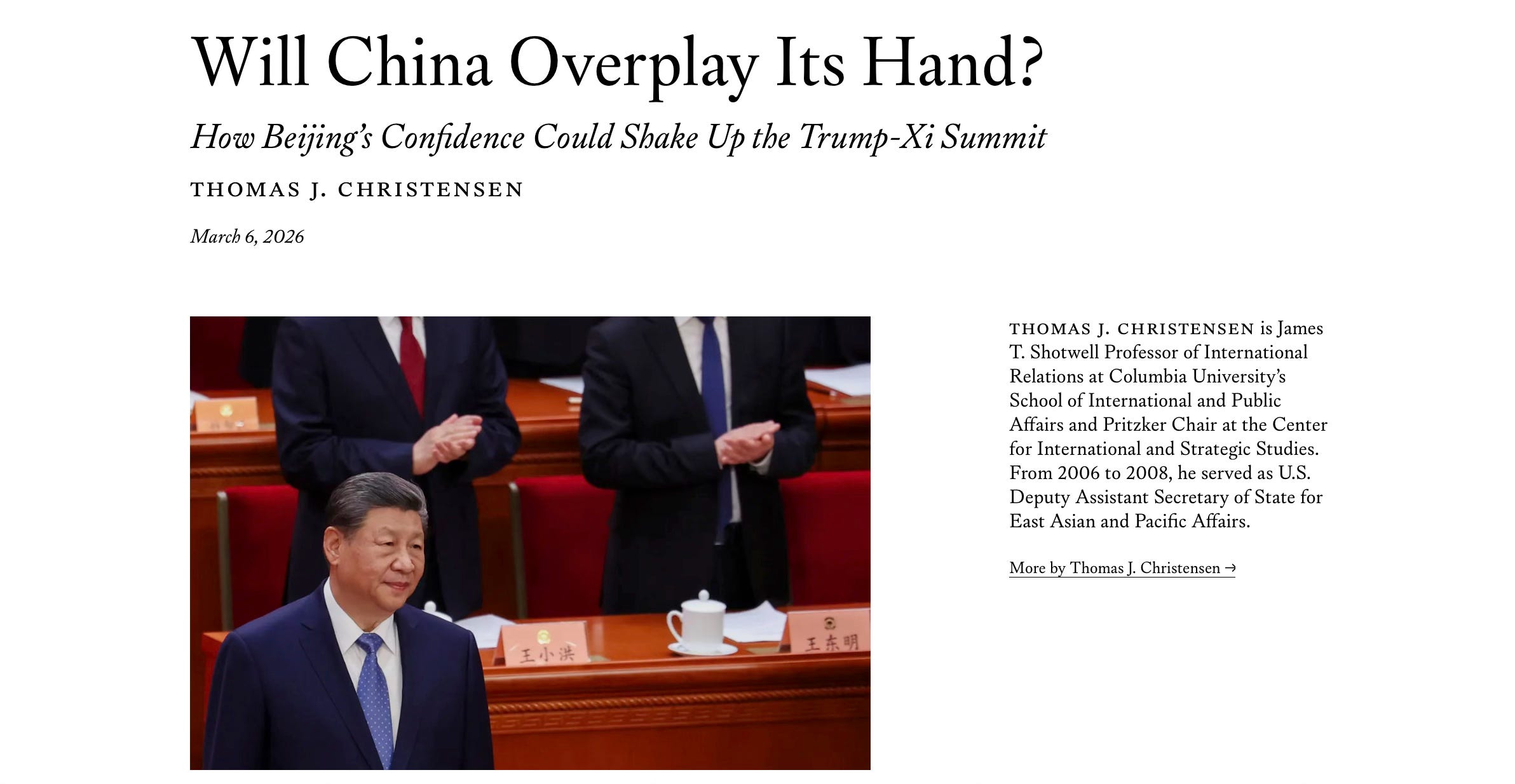 In this article published by Foreign Affairs, the author examines how the Chinese leader might approach the forthcoming summit with President Trump. The author notes that “the most significant factor that will shape the upcoming Trump-Xi meetings will be Beijing’s perception of its own apparent success in 2025 in responding to U.S. threats with resolute counterthreats…Many Chinese experts believe that Beijing, unlike other capitals subjected to Trump’s threats, managed to back Washington into a corner and that this outcome signaled China’s arrival as a global power on par with the United States.” How this will influence the coming summit remains to be seen. You can read the full article here.