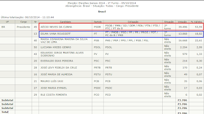 Uma ilustração desse ponto são os dados na tabela logo abaixo. Eles mostram a votação de Aécio e Dilma no primeiro turno entre os eleitores que votaram em trânsito.