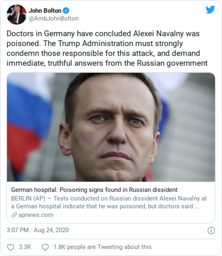 After German doctors said Navalny was probably poisoned with a nerve agent this week, the U.S. did finally offer substantial official statements on Tuesday — albeit not from Trump. Pompeo said the United States was “deeply concerned” about the case, while U.S. ambassador to Russia John Sullivan called for an “immediate, comprehensive, and transparent investigation.”