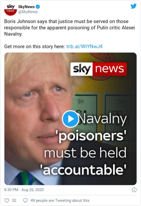 Britain’s Boris Johnson joined the chorus Wednesday by publicly demanding an investigation. “You really have to ask yourself what has gone on here, and I think what we want to see is a full, thorough, transparent investigation into the poisoning of Alexei Navalny,” Johnson later told reporters.