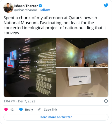 But tensions endure. The boycott by its neighbors inflicted significant economic harm on Qatar, though its vast wealth in petroleum reserves enabled it to ride through the storm. Relations between Qatar and nearby Bahrain are still in a deep freeze, with direct flights suspended between the two countries. Though officials in Doha, Riyadh and Abu Dhabi have all publicly sought to bury the hatchet, a wide set of disagreements remain, some more ideological than others. Before the blockade, Qatar was seen by its neighbors as being too accommodating and supportive of political Islamist movements elsewhere in the Middle East and North Africa. To this day, Doha and Abu Dhabi back rival proxy factions in Libya’s intractable civil war and take different positions on a host of thorny geopolitical issues, including how to confront Iran. “The Qatari leadership for its part wants to do everything to project an image of taking the high road and reconciling [with its neighbors],” said Gerd Nonneman, a professor of international relations and Gulf studies at Georgetown University’s campus in Doha. “But there does remain something of a trauma and genuine trust is far from healed — indeed is unlikely ever to fully be.” As my colleague Kareem Fahim reported among the crowds at the World Cup, the high-level summitry on the sidelines of the games paled in comparison to the Pan-Arab goodwill generated by those attending them. “Diplomatic initiatives during the tournament … added to a sense of regional comity,” Fahim wrote. “In interviews, though, few fans mentioned the diplomacy as a spark for solidarity, suggesting leaders were taking cues from their people, rather than the other way around.” Tellingly, the National Museum of Qatar, which opened in 2019, doesn’t trumpet post-blockade reconciliation. The complex, a stunning structure whose design is inspired by the intricate layers of a desert rose crystal, was opened in 2019 in the depths of Qatar’s standoff with its neighbors. Nonneman suggested to me that the suddenness of the 2017 boycott “changed the mosaic of Qatari identity” — which had long been cast in connection to “Khaleeji” counterparts in countries like the UAE — and the experience of the blockade “strengthened” a particular “Qatari sort of identity,” which also is connected to the ruling al-Thani family. Qatar, which counts just over 300,000 citizens, was mocked for enlisting imported Lebanese fans to back the country’s team at its three losing matches during the World Cup. But the national museum’s ideological project offers a clearer narrative of identity and nationhood. It anchors the journey of the Qatari people in a kind of global primordial past — linking Qatar’s indigenous nomads not simply to Bedouin Arab neighbors in the region, but to Mongolian communities in the steppes of Central Asia and the Tuaregs of the African Sahel. While acknowledging the scant material evidence of a discernible, ancient “Qatari” past — for centuries, the peninsula was largely a backwater, washed over by waves of empires, from the Persian Sassanids to the Ottomans, Portuguese and British, and home only to small towns of traders, pearl-divers and fisherfolk — it develops a concrete story of Qatar’s rise tethered to the mid-19th century emergence of the al-Thani dynasty. We learn of how Qatar’s fledgling rulers, starting in the 17th and 18th centuries, engaged in endless feuds and skirmishes with rival petty potentates in Bahrain and Abu Dhabi, a tacit nod to the deep history of modern grievances. We see its role as a pawn in the broader geopolitical tussles between larger principalities in the region — from the first Saudi state to the maritime power of Muscat in what’s now Oman to the Ottoman and British empires — leading ultimately to its status as a British protectorate until its independence in 1971. And we also hear of Qatar’s fascinating journey from a relatively poor, sparsely populated territory dominated by the pearl-diving industry to its emergence as a hydrocarbon giant in recent decades and one of the richest countries per capita on earth. Videos of elderly Qatari notables relay the humble lives they once lived in the early part of the past century, with some describing days spent shucking oysters for a pittance while subsisting on a handful of dates as food. The Indian rupee was the main currency of the peninsula for years, with prominent pearl merchant families anchoring their businesses on the ability to make the voyage to metropolitan Indian cities like Mumbai and Karachi, now in Pakistan, and sell their raw goods to eager South Asian customers. Now, the tables have turned. Qatar’s energy wealth has led to Doha turning into a major cosmopolitan hub for the Middle East and the broader region, including South Asia. Hundreds of thousands of Indian and Pakistani workers have come here for the opportunity to earn in Qatari riyals and significantly outnumber Qatar’s small population of citizens. The museum’s propagandistic displays tout testimony from some of these migrants, grateful for their welcome and eager to contribute to Qatar’s exciting future. Nothing is said, of course, of the documented abuses and difficulties faced by a legion of these migrants. Nor does the museum devote much space to the mammoth project of the World Cup, whose legacy is still being determined. But it does feature in a glass case the winning FIFA ballot that announced the success of Qatar’s controversial bid in 2010 and set into motion the tumultuous transformations of the past decade. | ||||||||||||||||