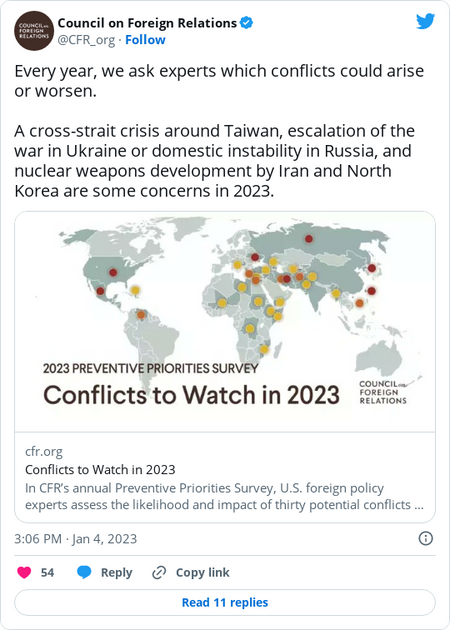 The seven most pressing threats in 2023 enumerated by the survey are as follows: The advent of “a severe cross-strait crisis” that pulls the United States into a confrontation with China over Taiwan; an escalation in the Ukraine war that sees “unconventional weapons spillover into neighboring countries”; a cyberattack hitting U.S. critical infrastructure; economic collapse and social unrest within Russia because of the toll of the war, leading to a destabilizing spiral; North Korea stepping up its testing of nuclear weapons and long-range ballistic missiles; Israel’s right-wing government taking covert or direct action against Iran’s nuclear program, with diplomacy over Tehran’s nuclear capabilities at a dead end; and the possibility of natural disaster and social unrest in Central America spawning a new surge of migration to the United States.