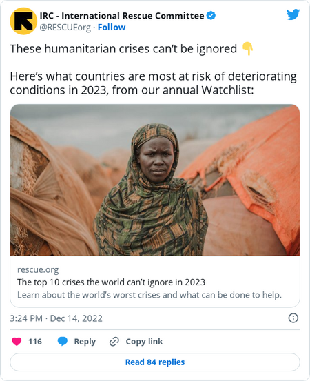 But there’s a lot more to worry about in the world. Two recent studies — one by a think tank, the other by a humanitarian international organization — lay out the challenges that should vex global policymakers in 2023.